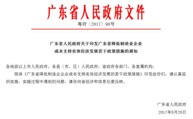 广东省降低制造业企业成本支持实体经济发展的若干政策措施